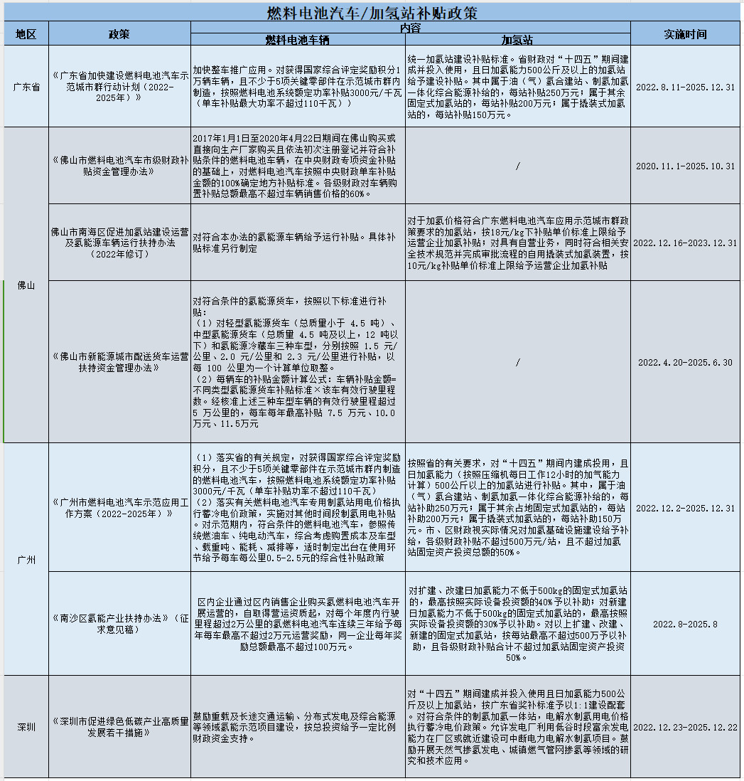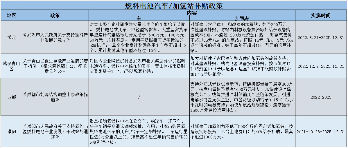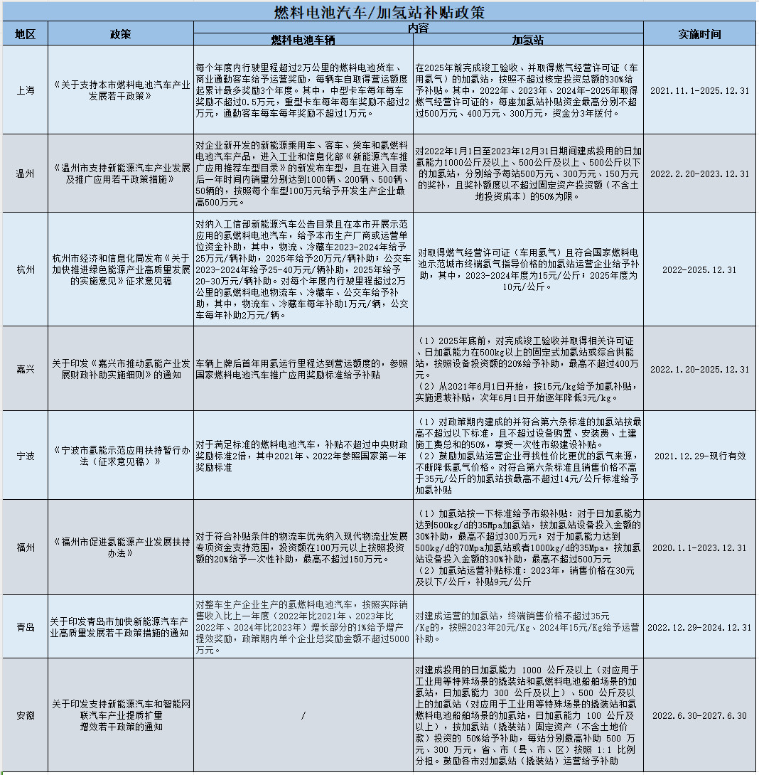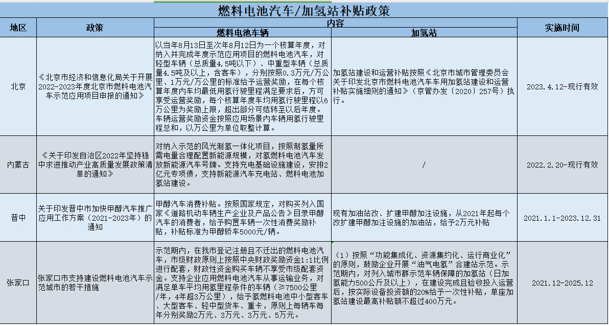 With the continuous improvement of the hydrogen fuel cell industry chain and the guidance of the policies of various provinces and cities, China's hydrogen energy and fuel cell industry has developed very rapidly. The following is the current effective subsidy policies for fuel cell vehicles / hydrogenation stations summarized by our company: